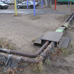 - Более 100 метров голых труб тянутся от пр. Абая, 14 до ул. Волынова, 16. Изоляция с них исчезла летом, когда все активно жгли пух. В результате пожар охватил и изоляцию на трубах, которая сгорела практически вся. На той части труб, где она есть, изоляция настолько ветхая, что все равно не спасает трубы от потери тепла.