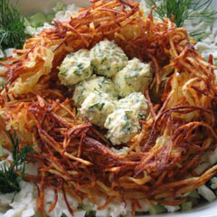 Затем воду слить, лук промыть в холодной воде. Картофель почистить, нарезать тонкой соломкой. Можно, в принципе, потереть на крупной терке, чтобы получилась длинная «соломка». Пожарить его в большом количестве растительного масла. Чтобы картофель не слипался, рекомендую жарить его маленькими порциями. Огурцы нарезать соломкой. Отделить белки от желтков.