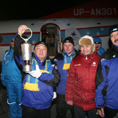 В 22.10 самолет приземлился, и на трапе появился руководитель хранителей огня Раниль Акчурин. Он передал колбу с огнем акиму Костаная Жомарту НУРГАЛИЕВУ. Под дружные выкрики выстроившихся коридором спортсменов «Алга, Казахстан!» аким в сопровождении четырех хранителей огня Азиады пронес его в здание аэропорта.