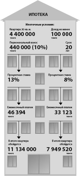 Итог тот же: «хрущевка» стоимостью $30 000 (4, 4 млн тенге) через 20 лет выльется мне в 11,135 млн ($75 748). Печально. Беру в руки калькулятор и срочно пересчитываю ипотеку под предлагаемые 8%. Ситуация меняется, но не кардинально. Доход также должен быть не менее 100 000 тенге в месяц. Ежемесячный платеж снижается с 43 000 до 33 000 тенге, а конечная стоимость квартиры составляет без малого 8 млн. Переплата почти в 2 раза. Ну и, кроме того, пока о 8% только заикнулись. Когда идея станет реальностью - бог весть.