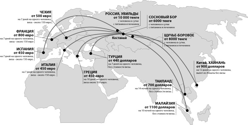 О ценах на европейское направление. По сравнению с 2009 годом путевки во Францию стали дороже как минимум на $300. А в Испанию, Италию не подорожали. Если вылетать из Москвы, то путевки можно купить от 450 евро. Если же вылет будет из Екатеринбурга, путевка обойдется от 600 евро и выше. Туроператоры отмечают, что путевки с вылетом из Москвы самые дешевые, так как оттуда больше ежедневных рейсов. Но надо учесть и расходы на дорогу до Москвы. Билет из Костаная до Москвы стоит от 33 000 тенге, из Челябинска - от 25 000 тенге.