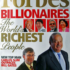 Богатейшим человеком, по версии журнала «Форбс», признан мексиканец, телекоммуникационный магнат Карлос Слим, чье состояние оценивается в $74 млрд. За год Карлос Слим увеличил свой капитал более чем на $20 млрд. Вторую позицию занимает основатель «Майкрософта» Билл Гейтс с $56 млрд, а третью - инвестиционный гуру Уоррен Баффет с $50 млрд.
