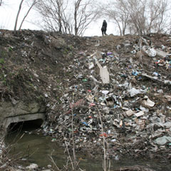 Спускаемся. Трубу практически не видно, вода еле сочится сквозь нее. Старый унитаз, труп собаки, горы пластика, строительный мусор, остатки ветоши и пищевые отходы. Некоторые люди оказались более «гуманными» - они выкидывают мусор прямо в пакетах. Бумага раздувается по ветру. Здесь же бегают собаки в поисках корма. Такие живописные картины украшают практически всю территорию лога. Цивилизация только в одном месте - в районе ул. Бородина. Вырублен кустарник, нет камыша и мусора. Через улицу положена новая пропускная труба. Она заканчивается через 50 м, как только лог делает поворот за здание. Здесь снова сплошная свалка, трубы везде заилены. А жители частного сектора спустили в лог еще и трубы от канализации.