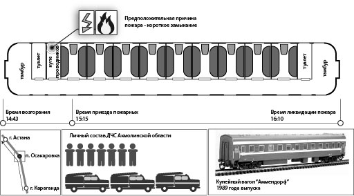 Возгорание произошло в 80 км от Астаны - недалеко от поселка Осакаровка. Противопожарная сигнализация не сработала, поэтому люди не сразу разобрались что к чему. Когда кто-то в вагоне закричал «Пожар!», началась паника. Окна в купейном вагоне были открыты, что способствовало быстрому распространению огня.