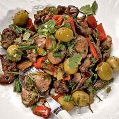 Нужно полкило куриной печени. Можно взять и говяжью, и баранью, но куриная предпочтительнее - нежная, жарится быстро. Каждую печеночку разрезать на 2, максимум 3 куска. Произвольно нарезать шампиньоны, обжарить на растительном масле до готовности. В другой сковороде обжарить лук, добавить к нему печенку, готовить буквально минут 5-6, потом присовокупить к ним нарезанный тонюсенькими колечками острый перец (количество - по желанию), грибы, оливки без косточек и пучок мелко нарубленной зелени кинзы. Все это подержать на огне еще 2-3 минуты, и можно есть. Холодной эта закуска тоже хороша.