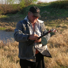 Едем дальше. На берегу третьей старицы рыбачат карасятники. Это уже радует. Подъезжаем. Приехав сюда за полчаса до нас, они умудрились поймать по нескольку почти ладошечных карасиков. Сидят рыболовы на противоположном от подветренного берегу. На подветренный же не добраться - старица слишком длинная и заросшая. Пристраиваюсь неподалеку от карасятников. Забрасываю удочку. Сидеть далеко не комфортно: сзади спину пригревает майское солнышко, а в лицо активно дует настырный холодный ветер. На ветру поплавок балансирует так, что поклевок я не вижу. Наугад время от времени проверяю червя на крючке - он весь объеден - значит клевало, но когда? Сабаней находит брод. Одевшись в резиновый комбинезон, он перебирается на подветренный берег. Перебрасывает комбинезон мне - я тоже успешно переправляюсь. Здесь, под обрывом, ветра почти нет. Прикармливаем, устраиваемся поудобнее, забрасываем удочки. Сабаней пятиметровку, я - бамбуковую трехметровку.