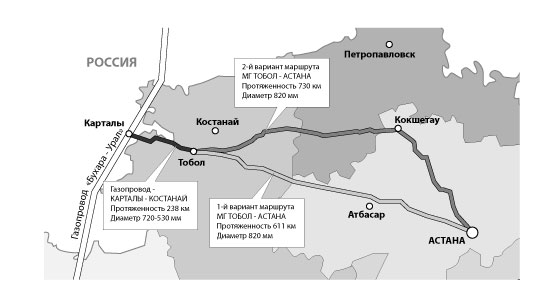 Два маршрута прохождения магистрального газопровода отличаются по протяженности и затратам. Первый вариант - газопровод пройдет по маршруту Тобол-Атбасар-Астана. Его протяженность составит 611 км. Второй предлагают строить по маршруту Тобол-Кокшетау-Астана. Его длина составит 730 км.