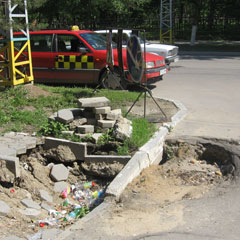 В этом месте даже поставили знак земляных работ. Но работы не ведутся уже несколько недель. А ямы все расширяются и зарастают мусором. В обоих ямах мы обнаружили кучу пластиковых и пивных бутылок, бумажки. И незаасфальтированная яма в центре Костаная постепенно превращается в небольшую свалку.