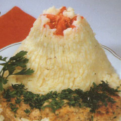 В центр вершинки поставить половинку скорлупы яйца, тщательно вымытую. Майонезом и кетчупом сделать полосы, ведущие от верхушки горки вниз. Запекать будущий «вулкан» в духовке до готовности фарша, пока он не станет золотисто-коричневым. Кстати, фарш сверху не обязателен. Можно внешние стенки вулкана оставить картофельными.