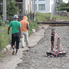С начала лета на ул. Узкоколейной в Костанае подводят коммуникации к строящемуся коттеджному поселку. Подрядчик - астанинская фирма ТОО «Лир» - проложила водопровод в обход жилого сектора, а канализацию стала тянуть мимо домов. Возле дома № 16 траншея прошла через тротуар.