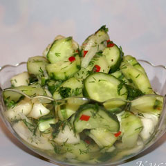 Салат: огурцы - 2кг, яблоки 1 кг, петрушка - 50 г, укроп (зелень)50 г, масло растительное, мед - 50 г, соль - 40 г, уксус фруктовый 100 г.