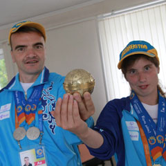 - Идея развивать бочче в Казахстанае принадлежит генеральному директору «Спешиал Олимпикс Казахстана» Ольге Бахаревой, - рассказала Нонна Рубан. - Костанайский филиал сразу идею поддержал и с 2007 года у нас начал развиваться этот специальный вид спорта. Сейчас команда Костанайской области - лидер в Казахстане. Поэтому, когда решался вопрос, какой вид спорта будет представлять область, я решила остановиться на бочче. Серьезную подготовку начали год назад, когда закупили специальные шары. До этого тренировались самодельными шарами, которые накачивали водой. Корт у нас до сих пор самодельный, сделанный из досок. Из-за этого на соревнованиях возникли сложности. У нашего самодельного корта нет бортов, и спортсмены не умеют кидать шары около них. Чтобы спортсмены из других команд не воспользовались этим преимуществом, Ян и Дарья старались сразу захватить и удержать лидерство. Конечно, сначала мы испугались, но потом настроили друг друга и твердо решили, что победа будет за нами. И у них все получилось.