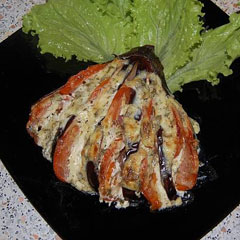 Теперь выкладываем наши веера в форме, которую стоит сбрызнуть растительным маслом. Кладем баклажаны, раздвигаем полоски и вкладываем между ними последовательно сыр, мясо, помидоры. Перчим и сверху поливаем заправкой.