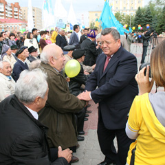 После этого глава области отправился общаться с народом, он пожимал руки ветеранам и поздравлял их с праздником. Встретив молодую пару, гуляющую с ребенком, и узнав, что у них девочка, аким одобрительно сказал: «Молодцы! Страна - тоже женского пола».