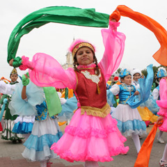 Старт карнавальному шествию был назначен на 11 часов утра. Его участники начали собираться за час до начала. Танцевальные коллективы, спортивные колонны, дети в национальных костюмах, ростовые куклы, во главе - духовой оркестр областной филармонии. Маршрут парада масштабами не впечатлял, всего около 300 м - от областного акимата до Сити-центра. На короткой, но зрелищной дистанции не обошлось без казусов и смешков «из зрительного зала»: с пересечения пр. Аль-Фараби и ул. Алтынсарина параду пришлось пробираться сквозь дым от шашлыков, которые традиционно начали жарить в Сити-центре, прямо под окнами недавно отстроенной прокуратуры.
