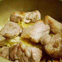 Предлагаю попробовать свинину со сливами, приготовленную в горшочке. Свинину брать лучше попостнее. Нарезаем ее небольшими кубиками и обжариваем вместе с репчатым луком на растительном масле до красивой корочки. Пока жарится, тонко шинкуем белокочанную свежую капусту. Чуть-чуть мнем ее, добавляем к мясу, солим, кладем специи - смесь перцев, кориандр и тмин. Все перемешиваем, оставляем на огне минут на пять. Теперь очередь слив. Вообще в это блюдо полагается класть половинки крепких желтых слив, но я пробовала и красные, и даже синие. Получается вкусно, лишь бы сливы были крепенькие. Если вас смущает цвет (а синие сливы окрашивают блюдо), можно с плодов снять шкурку, ошпарив их кипятком.