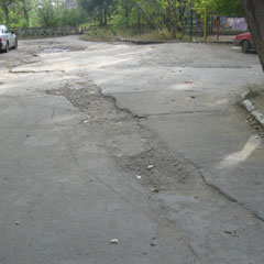 На месте корреспонденты «НГ» увидели три ямы. Две небольшие располагались в торце дома № 15 по ул. Гвардейской. Рядом с ними зияет большая яма, о которой сообщил читатель. Она действительно занимает половину проезда. При этом затрудняет проезд не только машинам, но и детям, катающимся по двору на велосипедах.