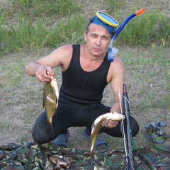 Стоя над обрывом и лицезрея открывшуюся перед нами красоту, я уже забыл утреннюю гаражную возню. Я уже представлял, как буду колпашить щук, лещей, налимов. Подводная охота намного продуктивнее, чем обычная рыбалка. Поэтому есть хорошая возможность «умыть» Серегу. Пока там он будет махать своим спиннингом и моими блеснами, я уже полтора десятка завалю. У нас с ним соревновательный процесс присутствует всегда и везде. Но мой энтузиазм стал затухать по мере того, как начал я переодеваться. Процедура эта немного длительная, и пока я облачался в гидрокостюм, уже изрядно озяб. Температура в это время была +2 С и присутствовал неприятный ветерок. А еще надо в воду лезть! Ужас! Блин, думаю, был бы один, ни за что не полез. А тут Серега стоит в фуфайке и зыркает на меня, надо же показать ему, что я не слабак, как некоторые.