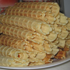 Теперь начинка. Основа для нее - сладкая творожная масса, которую надо сделать более вкусной. Во-первых, творог надо смешать с размягченным сливочным маслом, в противном случае ваши вафли быстро отсыреют. Во вторых, мы смешаем творог с яблоком, грушей. Их нужно нарезать мелкими кубиками и карамелизовать с добавлением сливочного масла и сахара. Держать фрукты на огне, пока они не станут прозрачными, а сок не выпарится, точнее - не загустеет. Теперь к ним нужно добавить корицы, остудить, соединить с творогом, перемешать и нафаршировать наши трубочки. Можно с помощью кондитерского шприца. Все, наш взрыв вкуса - лимон, банан, корица, яблоко, груша (их можно заменить другими фруктами или орехами) - готов к употреблению.