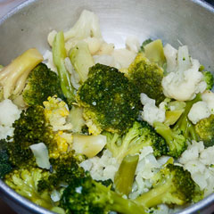 Цветную капусту и брокколи разделить на соцветия, промыть. Бланшировать 5 мин. в кипящей подсоленной воде. Так же поступить с морковью, нарезанной крупными кружками. А грибы - шампиньоны или лесные - жарить минут 10 на сливочном масле. Если шампионьоны крупные, то шляпки лучше разрезать на четыре части, мелкие - пополам. Постную ветчину нарезать полосками или кубиками и вместе с капустой, грибами, морковью выложить в форму для запекания. Натереть хороший кусок сыра типа гауды.