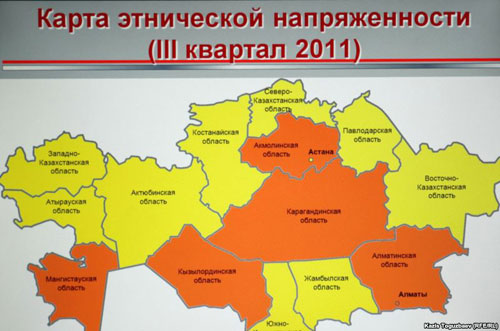 По словам Бурнашева, институт получает данные о событиях с этническим содержанием из открытых источников - средств массовой информации и информационных агентств. Социальные настроения изучаются посредством опросов населения, проводимых в административных центрах 14 областей, Астане и Алматы. По итогам таких исследований, наиболее критическая ситуация в третьем квартале наблюдалась в Карагандинской и Мангистауской областях - соответственно в связи с преобразованием школы в Темиртау и заявлениями об оралманах.