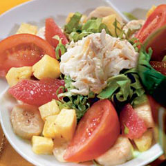Смешать сельдерей с майонезом. Выложить на тарелку вперемешку кусочки фруктов и овощей, салат, приправить сверху майонезом с сельдереем. Между прочим, вкусно получается и с консервированным ананасом.