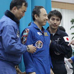 Первые шаги по земле космонавтам давались с трудом. По внешнему виду наиболее тяжело приходилось японскому астронавту. В отличие от своих коллег, Сатоси ФУРУКАВА летал в космос первый раз. Тем не менее японец достаточно живо ответил на вопрос журналиста о проделанной им научной работе. Фурукава по профессии врач, поэтому проводил в космосе эксперименты в области медицины, в частности, изучал возможности блокирования кровеносных сосудов, которые приносят питание раковой опухоли от незараженных клеток.