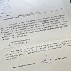 После ознакомления с письмом возникли закономерные вопросы. На каком основании государственный служащий указывает частнику, как тому тратить его деньги? И как часто поселковому приходится отчитываться о подписке акиму района? С акимом Костанайского района Ахмедбеком Ахметжановым поговорить не удалось, его секретарь, узнав, что на другом конце провода корреспондент «НГ», неизменно отвечала, что акима нет на месте. Поэтому вопросы мы задали автору. Его ответ не только противоречил тексту письма, но и звучал странно: оказывается, акимату понадобилось собирать квитанции для контроля над работой почтальонов. Причем отчитаться должны были и те жители поселка, которые на проблемы с доставкой еще и не жаловались.