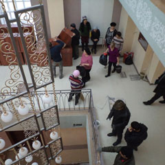 Усилиями помощников пол вымыт, лестницы блестят, «призывники» из школ стоят, явно скучая, разговаривают.