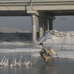 В пятницу, 2 декабря, редакции «НГ» сообщили о том, что под новым мостом через реку Тобол в районе КЖБИ, в протоке плавает лебедь. Корреспонденты позвонили в водно-спасательную службу и вместе со спасателями выехали на место.