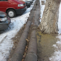На месте корреспонденты «НГ» увидели открытую теплотрассу, стоило наступить на нее заснеженным ботинком, как из трубы сразу пошли клубы пара. Около трех метров трубы были полностью открыты, еще на участке длиной более 10 м видны лишь куски изолирующего материала.