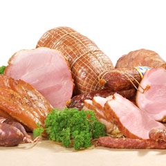 Ветчина - производное от просоленного и прокопченного свиного окорока. Мясо сначала солят сухим посолом или в рассоле, затем могут отварить, отварить и закоптить, отварить и запечь. Большое разнообразие вкусов.