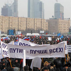 Протестная суббота в Москве, 4 февраля, впервые свела в «поединке массовости» противников и сторонников Владимира Путина. Из четырех уличных акций, состоявшихся в 20-градусный мороз, интерес наблюдателей и комментаторов вызвали антипутинское шествие по Большой Якиманке, завершившееся митингом на Болотной площади, и «антиоранжевый» митинг на Поклонной горе.