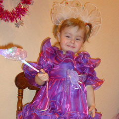 Виолетта любит наряжаться, примерять новую одежду, складывать ее и ходить в бабушкиных туфлях на высоких каблуках. Дедушку Мороза она встречала в костюме прекрасной принцессы.