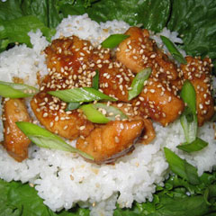 Затем в тяжелую сковороду или сотейник влить 1/2 стакана воды, положить лавровый лист, курицу вместе с маринадом. Довести до кипения, накрыть и тушить на медленном огне минут 30, пока мясо не станет мягким. Затем снять крышку и готовить еще 15 мин. Подавать вместе с соусом и гарниром из риса.