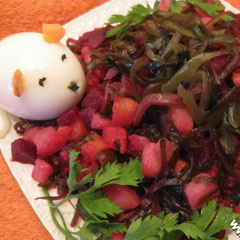 Нет вроде бы ничего привычнее этой овощной закуски. Попробуйте придать ей новый вкус, добавив к традиционным ингредиентам для винегрета морскую капусту. Можно приготовить ее самим, хорошенько промыв и отварив сухую ламинарию, а можно купить уже консервированную в банках. Вы удивитесь, насколько органичным будет сочетание вкусов в этом винегрете. А уж польза - колоссальная: витамин С, который лучше всего из овощных заготовок сохраняется в квашеной белокочанной капусте, и йод, которым богата морская капуста.