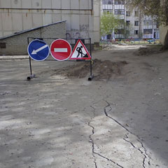 Перерытый участок при въезде во двор занимает метра три в длину и тянется до детской площадки. На въезде стоит знак «Ремонтные работы». После него - сплошная глина и пыль.