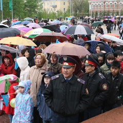 С утра 1 мая в Костанае пошел дождь, поэтому на площади перед областным акиматом народ слушал акима области, стоя под зонтами. Традиционно на мероприятии присутствовали госслужащие, медработники, учителя, участники этнокультурных объединений.