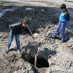 Корреспондент «НГ» побывал на этом месте, в торце дома № 342 сразу обнаружил открытый колодец с воткнутой в него веткой тополя. Глубиной примерно 4 м, на дне видна труба. Видимо, это хозяйство ГКП «Костанай-Су». Вокруг перекопано, лежат кучи глины, месиво липнет к ногам прохожих и колесам машин, загрязняя двор.