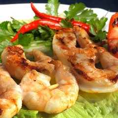 Мы на даче приспособились жарить шашлычки из креветок или просто запекать их на решетке. Быстро, вкусно, полезно. Но вот для этого нужны уже крупные креветки. Дома их надо загодя почистить и замариновать. Отличный маринад получается из соевого соуса с сахаром, соком лимона и раздавленным зубчиком чеснока. Прямо в маринаде, уложенные в металлический контейнер, креветки едут на дачу. Дальше их судьба может развиться по-разному. В сезон, когда уже есть овощи, их можно насадить на деревянные шампурчики вперемежку с маленькими помидорками, кусочками сладкого перца, ломтиками цуккини. И зажарить 4-5 минут на деревянных шампурчиках. А сейчас мы их печем на решетке. Держим, пока не зарозовеют.