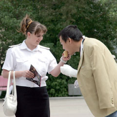 Представительный мужчина Владимир моментально оценил положение, залез в карман страждущего и купил ему стаканчик пломбира. Отдельное спасибо девушке Альфие. Она не только помогла вытащить деньги из кармана, но и отстояла небольшую очередь к мороженщице. В общей сложности из четырех спровоцированных прохожих лишь одна девушка отказалась помочь и, смущенно хихикая, удалилась.