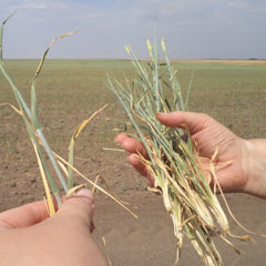 Но когда приближаешься, бросаются в глаза черные проплешины, изреженность и дистрофичность посевов - кущение слабо выражено, колос к концу второй декады июля совсем маленький. Мы - на поле близ тарановского поселка Николаевка. Температура в час дня - за 40 градусов, на землю рядом с хилой пшеничкой босой ногой не ступить. Жжет. Забираем с собой на память пару растений - вторичных корней у них нет совсем.