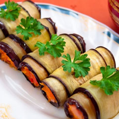 Еще один вариант начинки - сырная, но не с чесноком, а с креветками и огурцом. Сыр надо брать типа феты и еще смешивать с хорошим мягким творогом, примерно пополам. К этой смеси добавить мелко нарезанный зеленый лук и мелко же нарезанные креветки. Потом намазываете баклажанную пластину этой массой и накручиваете ее на брусочек свежего огурца. Можно к этим «роллам» сделать соус из натурального йогурта - ни в коем случае не кислого - в который добавлена горстка петрушки.