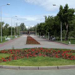 Если взять направление от главной арки по центральной аллее, то окажемся на Аллее героев, по обе стороны от которой размещены обелиски 36 героям Советского Союза и 6 кавалерам орденов Славы трех степеней. Сразу за аллеей - мемориальный комплекс памяти погибших кустанайцев в годы Великой Отечественной войны с фигурой воина-солдата у Вечного огня. Слева от мемориала - символ советского времени, памятник Владимиру Ленину.