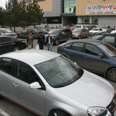 Торговый центр MART, суббота, 16 часов. На парковке между ЦУМом и центром забиты все места, машины уже и бросают посреди дороги, что значительно осложняет выезд тем, кто припарковался раньше. Маленькие верткие микролитражки и внедорожники имеют преимущество. «Матиз» может втиснуться в проем, куда другая машина не войдет. У владельцев джипов своя фишка - они едут по бордюрам и встают прямо на тротуаре. В том месте и так-то пешеходам приходиться лавировать между припаркованными авто, а здесь еще и на тротуаре - «Лексус».