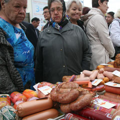 Фотографию, которая иллюстрирует эту статью, можно назвать свидетельством эпохи - эпохи строительства «капитализма с человеческим лицом». Продукты капиталистического производства на столе, а перед ним «счастливые» человеческие лица этого самого капитализма. Это фото с последней октябрьской ярмарки... да это и не важно, с первой или последней, в месяце или в году, или для кого-то вообще. Вспоминается анекдот эпохи недоразвитого социализма: художникам дали задание на полотне изобразить «голод», так 1-е место заняла картина, где художник изобразил полку, затянутую паутиной. (Я параллелей не провожу, но так хочется).