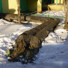 По указанным адресам корреспонденты «НГ» обнаружили три участка с порванной изоляцией. В основном трубы были открыты на участках труб, уходящих в землю. Еще на одной теплотрассе, недалеко от дома № 105 по ул. Маяковского, изоляции на трубах практически нет. Трубы закидали плитами, из которых валит пар.