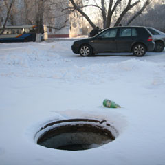 Корреспондент «НГ» побывал на указанном месте. На улице Пушкина, возле дома № 187 обнаружил два открытых колодца. Вокруг валяются пустые пивные бутылки. Какие коммуникации в них проходят, выяснить не удалось, так как внутри образовался лед. От него до поверхности примерно полтора метра. Кольца круглые, такие обычно ставят на колодцы водопровода. Вероятно, оба эти колодца принадлежат ГКП «Костанай-Су».
