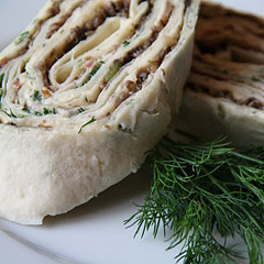 Теперь лист лаваша намазать плавленным сыром типа «Плавыч» или «Президент». Можно чистым сливочным, а лучше тем, который с ветчиной. Слой должен быть миллиметра три. На сыр надо посыпать измельченный свежий укроп и накрыть лист вторым листом лаваша. Его тоже смазать сыром и поверх распределить грибную массу. Сверху еще раз лаваш, сыр, укроп.