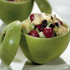 Десертный салат «Флорин». Большие зеленые и крепкие яблоки вымыть, срезать с плодов верхушку. Аккуратно вырезать яблочную мякоть. Крышечки можно сохранить. Удалить из мякоти яблок семена и жесткие перегородки, мякоть нарезать мелкими кубиками.